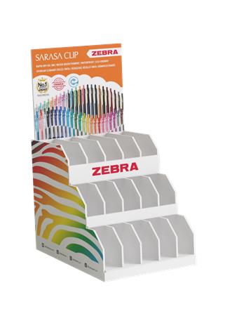 Praktikus PVC display 15 rekesszel, 150 toll kapacitással. A fejrész megforítható és el is távolítható. A fejrész egyik oldalán a Zebra márka, a másik oldalán a Sarasa zseléstollak láthatóak, így többféle márka is megmutatható.