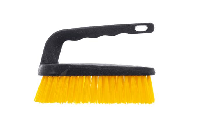 Fogantyús műanyag súroló kefe, műanyag szálakkal, nélkülözhetetlen takarítóeszköz a foltok és szennyeződések eltávolításához.